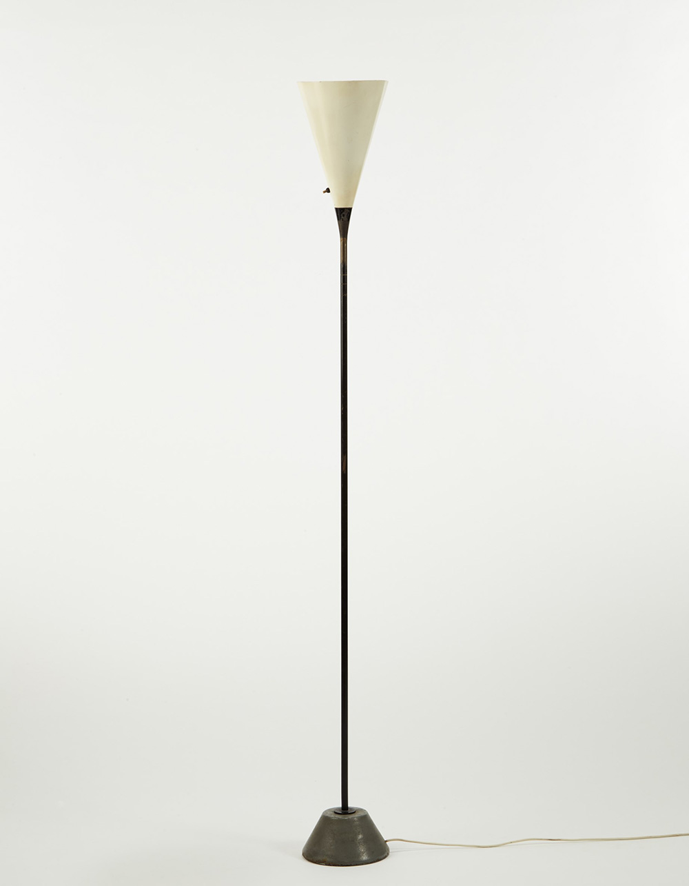 Gino Sarfatti (Venezia 1912 - Gravedona 1985) Lampada da terra modello "1051". Produzione Arteluce, Milano 1951. Riflettore in alluminio laccato bianco, fusto in ottone laccato nero, base in ghisa (h cm 176) (difetti e restauri) Bibliografia: M. Romanelli, S. Severi, Gino Sarfatti opere scelte 1938-1973, Silvana Editoriale, Cinisello Balsamo 2012, pp. 222, 449, 451