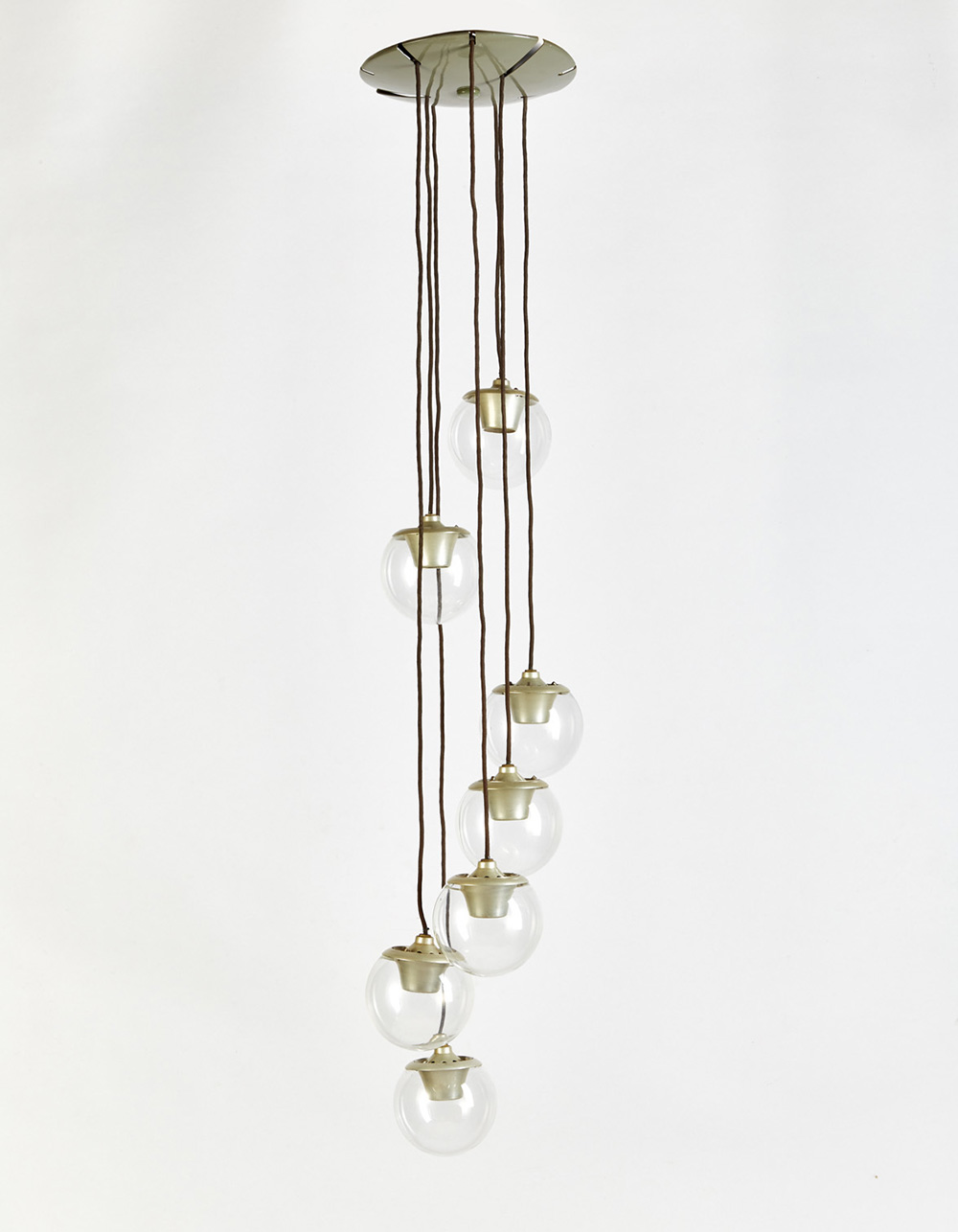 Gino Sarfatti (Venezia 1912 - Gravedona 1985) Lampada a sospensione modello "2095/7". Produzione Arteluce, Milano 1960. Riflettori (d cm 20) a sfera in alluminio tornito e lucidato, rosone in metallo verniciato nero opaco, cavi conduttori portanti (h cm 106) (lievi difetti) Bibliografia: M. Romanelli, S. Severi, Gino Sarfatti. Opere scelte 1938-1973, Silvana Editoriale, Cinisello Balsamo, 2012, pp. 298, 473; C. e D. Krzentowski, The complete designers' lights II, Jrp-Ringier, Zürich, 2014, p. 167 Lamp model "2095/7". Arteluce production, Milano 1960. Spherical polished aluminium reflector (d cm 20) (h cm 106) (minor defects) Bibliography: M. Romanelli, S. Severi, Gino Sarfatti. Opere scelte 1938-1973, Silvana Editoriale, Cinisello Balsamo, 2012, pp. 298, 473; C. e D. Krzentowski, The complete designers' lights II, Jrp-Ringier, Zürich, 2014, p. 167