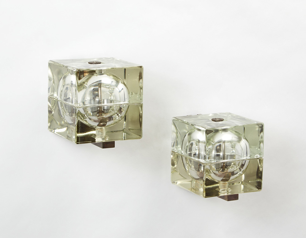 Alessandro Mendini (Milano 1931) Due lampade da parete modello "Cubosfera". Produzione Fidenza Vetraria, Italia, 1968. Vetro stampato e metallo. Con imballo originale (cm 16x16x16 cad) (difetti alle strutture)