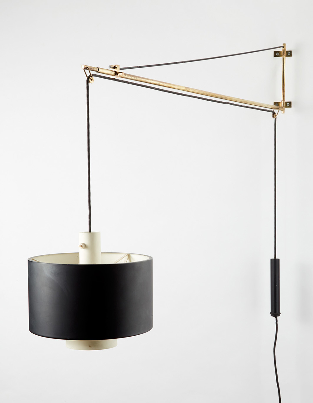 Gaetano Scolari Lampada a parete modello "2061". Produzione Stilnovo, Milano, anni 60. Braccio girevole in ottone lucido, movimento a saliscendi con contrappeso, riflettore in metallo laccato nero e bianco (d cm 18, l cm 131) (lievi difetti) Bibliografia: T. Bräuniger, Stilnovo. Apparecchi per l'illuminazione, Luminaires-moderniste, Berlin 2016, pp. 130, 150, 151, 165 Wall lamp model "2061". Stilnovo production, Milano 1960s. polished brass rotating arm (d cm 18, l cm 131) (minor defects) Bibliography: T. Bräuniger, Stilnovo. Apparecchi per l'illuminazione, Luminaires-moderniste, Berlin 2016, pp. 130, 150, 151, 165