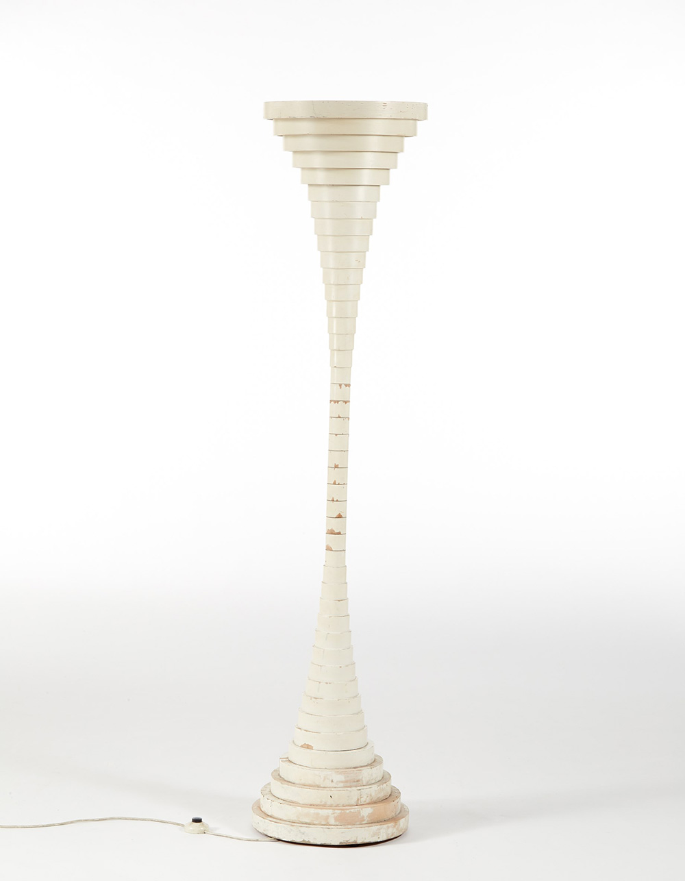 Paolo Portoghesi (Roma 1931) - Silvio Bilangione Lampada da terra modello "Helga". Produzione Fumagalli, 1967. Legno laccato bianco (h cm 175) (difetti) La lampada fu concepita per l'arredo di Casa Papanice a Roma, 1967-1970 Bibliografia: "Larivista dell'arredamento - Interni", n. 11, novembre 1967, pubblicità; C. Norberg-Schulz, Paolo Portoghesi architetto. Milano, Skira 2001