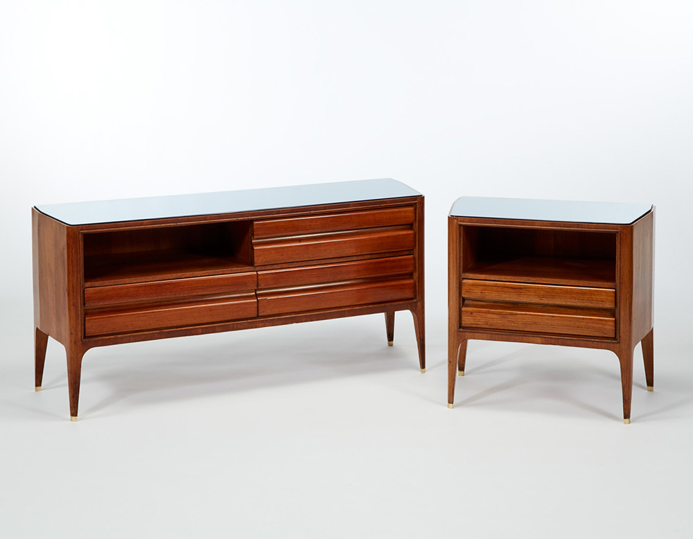 Luciano Baldessari (Rovereto 1896 - Milano 1982) Due comodini in legno di noce, piano in vetro trasparente azzurro-verde montati su lastra metallica, puntali in ottone. Esemplari eseguiti su disegno dell'architetto espressamente per per casa M.B. Milano, 1957 (cm 56x120x35 e cm 56x60x35) (lievi difetti) Provenienza: appartamento M.B. Milano Accompagnato da dichiarazione scritta degli eredi M.B. Two walnut wood bedside tables with glass tops. Samples produced expressly for the M.B. home in Milano 1957 according to the architect's drawing (cm 56x120x35 and cm 56x60x35) (minor defects) Provenance: M.B. apartment Milano Appended written declaration of the M.B. heirs