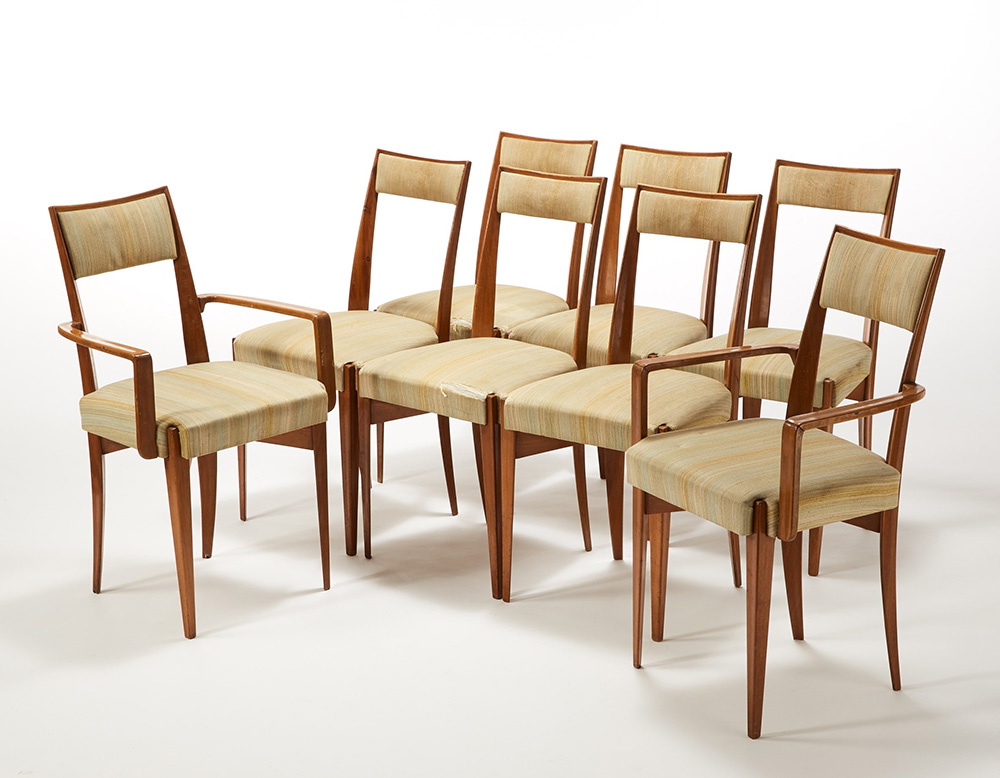 Melchiorre Bega (Crevalcore 1898 - Milano 1976) Lotto composto da sei sedie unite a due poltroncine con struttura in legno massello chiaro, gambe a sezione triangolare smussata, rivestimento in tessuto. Bologna, anni 50 (rispettivamente cm 46x90x43 e cm 54,5x90x43) (lievi difetti) Parere verbale dell'archivio Bega favorevole all'attribuzione.