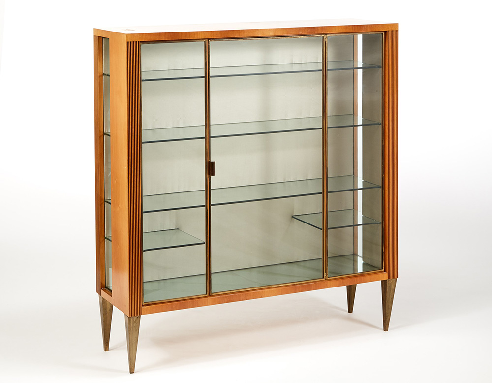 Melchiorre Bega (Crevalcore 1898 - Milano 1976) Mobile espositore impiallacciato in legno chiaro e filettato in ottone, con montanti verticali scanalati e gambe troncopiramidali in fusione di ottone. Interni a 5 ripiani di cristallo molato, schienale rivestito in tessuto bianco, antine in vetro con montatura in ottone. Bologna, anni 50 (cm 130x141x40) Parere verbale dell'archivio Bega favorevole all'attribuzione.