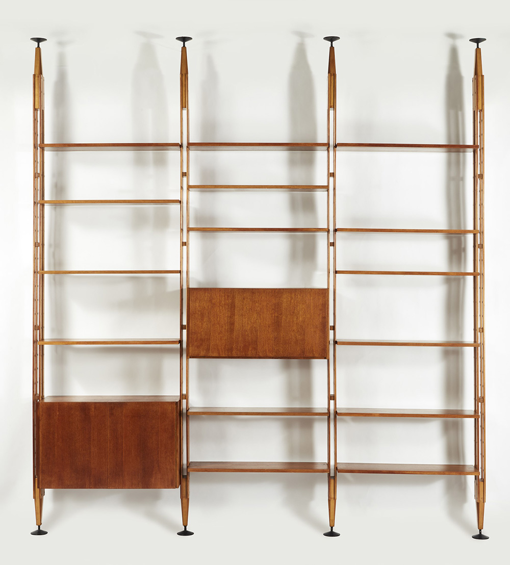 Libreria modello "LB7". Produzione Poggi, Pavia, anni 60 (disegno 1956) Legno massello, impiallacciato e bordato di noce e teak, due stipi e quindici ripiani (cm 260x277x35)(h cm 277 montanti lignei) (lievi segni d'uso)