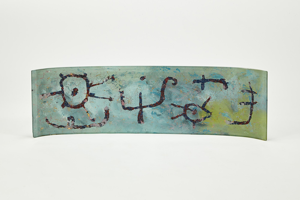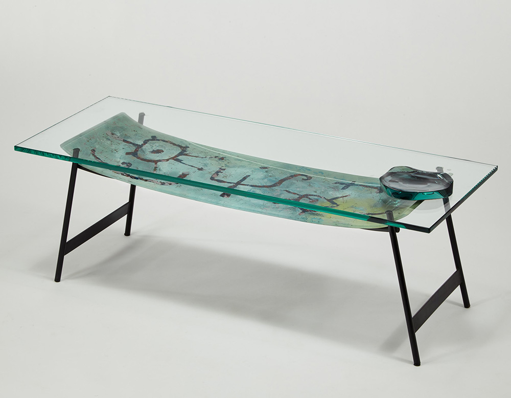 Duilio Bernabé (Bologna 1914 - Alpi Francesi 1961) Tavolino da salotto con piano superiore in cristallo molato, piano inferiore in cristallo molato e curvato retrodipinto con soggetto astratto policromo. Struttura in tubolare metallico laccato nero. Produzione Fontana Arte, Milano, anni 50 (cm 118x40x48) (difetti)