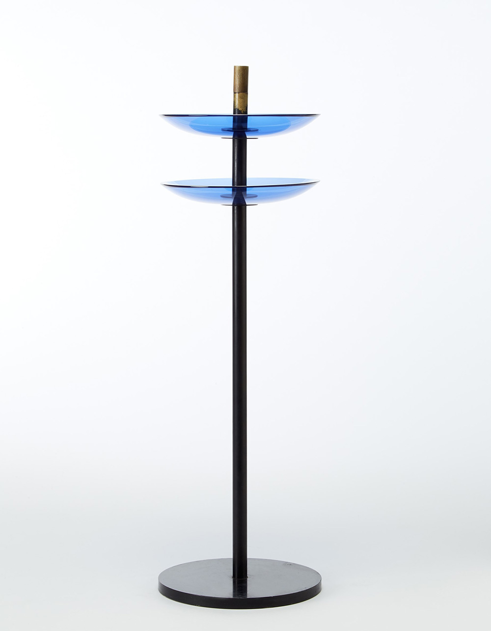 Fontana Arte Portaoggetti da terra modello "2087", Milano, anni 50. Cristallo blu curvato, metallo laccato nero (h cm 70) (lievi difetti) Bibliografia: Illuminazione & Arredamento, Cristalli d'arte, "Quaderni Fontana Arte" n. 6, p. 209