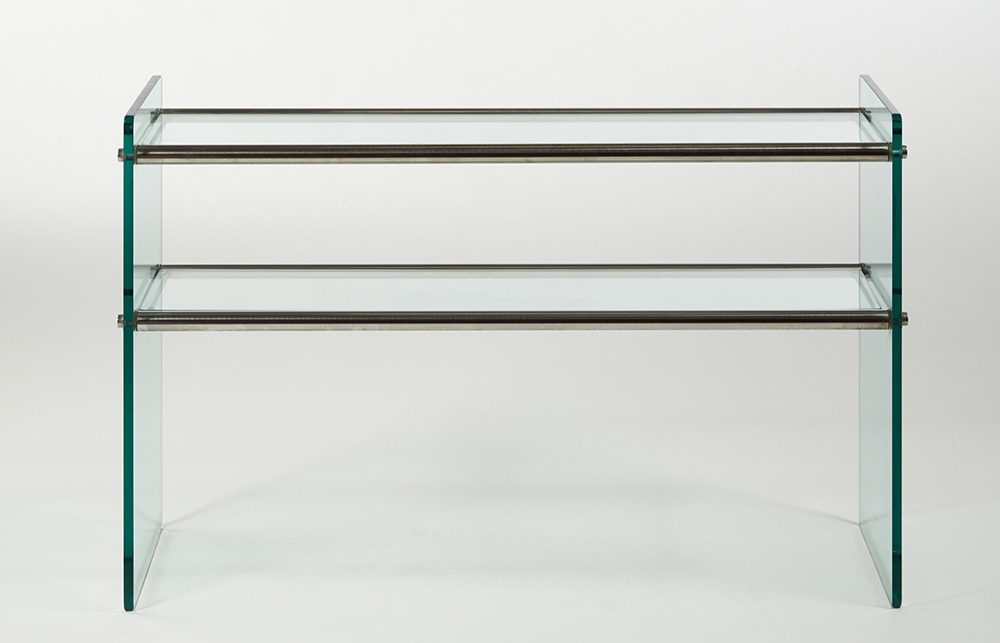 Brusotti (attribuito) Consolle a due ripiani in cristallo verdino molato di forte spessore, correnti in tubolare metallico nichelato. Italia, anni 40 (cm 117x75x34) (difetti)