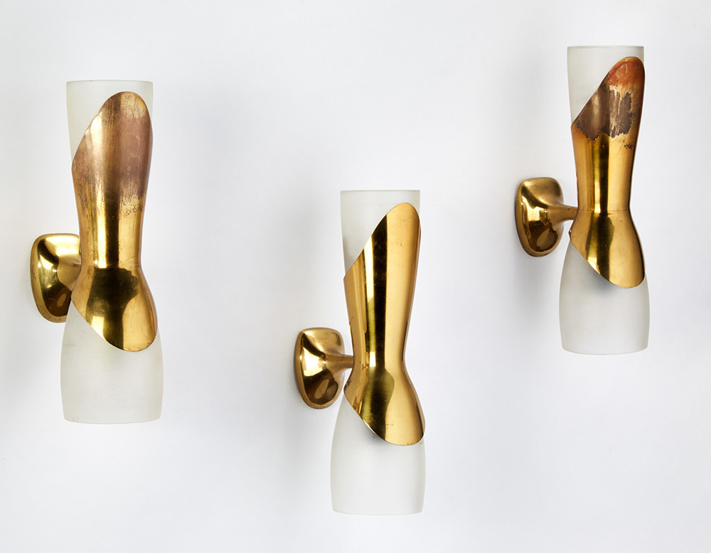 Pietro Chiesa (Milano 1892 - Parigi 1948) Lotto di tre lampade da parete con struttura in ottone e diffusori in vetro satinato sulla superficie esterna. Produzione Fontana Arte, Milano, anni 40 (h cm 26) (difetti)