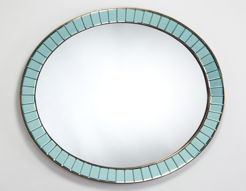 Max Ingrand (Bressuire 1908 - Parigi 1969) Specchio ellittico modello "1608". Produzione Fontana Arte, Milano anni 50. Cornice a elementi prismatici di cristallo colorato verdino specchiato, ghiera in ottone. Reca al verso l'etichetta adesiva della manifattura (cm 110,5x96,5) (difetti e restauri) Bibliografia: Arredamento, "Quaderni Fontana Arte" n. 2, p. 24