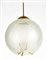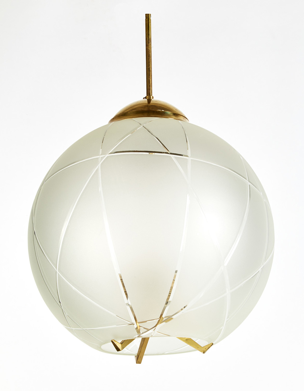 Max Ingrand (Bressuire 1908 - Parigi 1969) Lampadario a sospensione a tre luci, esecuzione Fontana Arte anni 50. struttura in ottone zapponato e metallo laccato bianco, globo diffusore in cristallo satinato e inciso da profonde molature (d cm 35, h cm 57) (lievi difetti) Bibliografia: "Rivista dell'arredamento", n. 48, dicembre 1958, pubblicità
