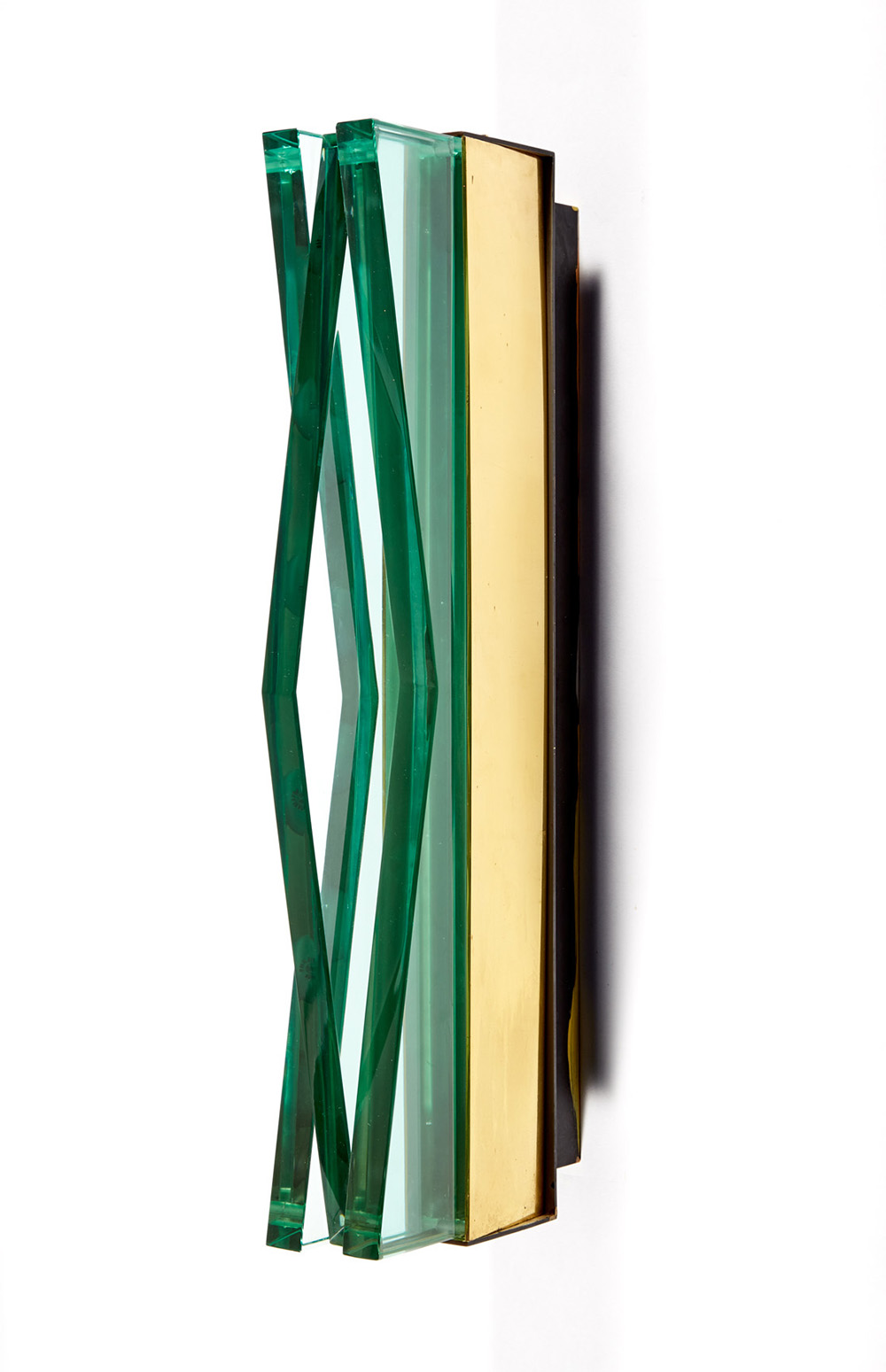 Max Ingrand (Bressuire 1908 - Parigi 1969) Lampada da parete modello "1829". Produzione Fontana Arte, Milano, anni 50. Tre cristalli sagomati, montatura in ottone (cm 9x63x26) (lievi difetti) Bibliografia: Illuminazione, "Quaderni Fontana Arte" n. 1, p. 57