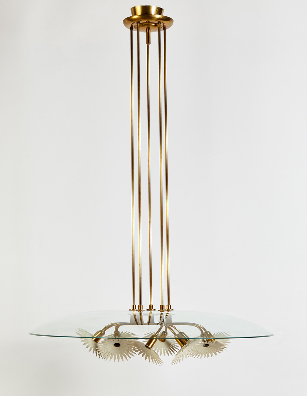 Pietro Chiesa (Milano 1892 - Parigi 1948) Lampada a sospensione a dieci luci con struttura in ottone e grande calotta a disco in cristallo molato e riflettori a forma di margherita in ottone laccato bianco. Produzione Fontana Arte, Milano, anni 30. Marcato a incussione con il monogramma della manifattura (h cm 122) (lievi difetti)