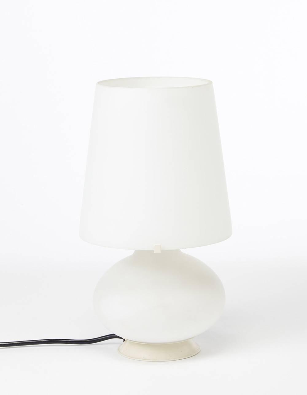 Max Ingrand (Bressuire 1908 - Parigi 1969) Lampada da tavolo modello "1853/0". Produzione Fontana Arte, Milano 1954. Alluminio laccato bianco e vetro soffiato lattimo satinato (d cm 20, h cm 34) (lievi difetti) Bibiliografia: Illuminazione, "Quaderni Fontana Arte", n. 1, s.d., p. 83