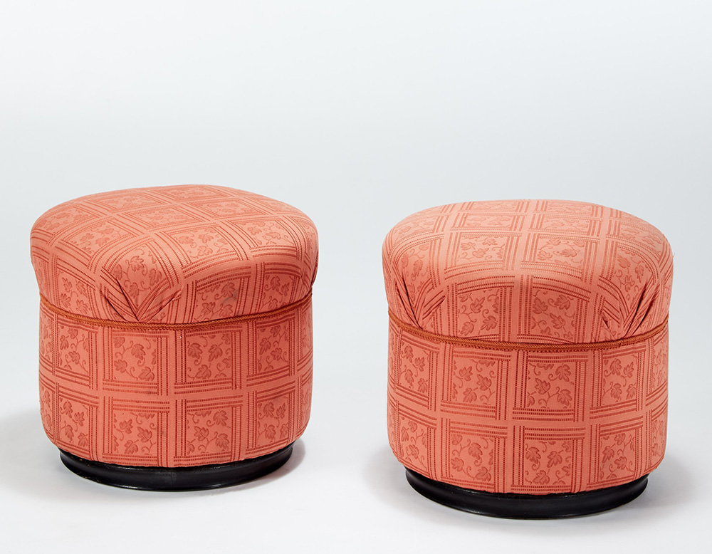 Piero Portaluppi (Milano 1888 - Milano 1967) Coppia di sgabelli imbottiti con base in legno ebanizzato profilato a gola rovescia stilizzata, rivestimento in tessuto rosato trapunto a foglie e riquadri. Milano, 1933 (d cm 44, h cm 43) (restauri) Provenienza: Casa Barich, Milano, 1933 Accompagnati da dichiarazione di autenticità della Fondazione Piero Portaluppi di Milano Bibliografia: Portaluppi. Linea errante nell’architettura del Novecento, a cura di L. Molinari, Skira, Milano 2003, p. 340
