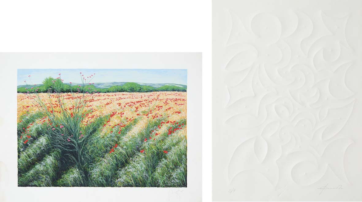AZZINARI F. - AMADIO G. Soggetti vari lotto di due grafiche 60x80 45x35 cm entrambe firmate Azzinari: serigrafia es. p.A. (l'opera presenta una piccola macchia di umidità sul lato passpartout in basso a sinistra) Amadio: multiplo su carta a mano es. 5/9
