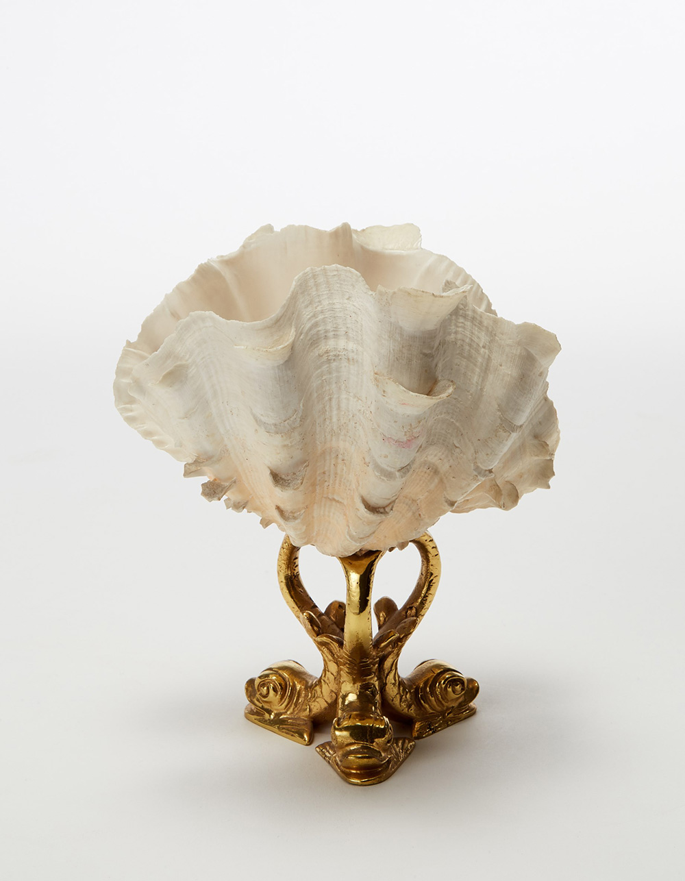 Gabriella Crespi (Milano 1922 - Milano 2017) Soprammobile modello "Tridacne" in fusione di bronzo cesellato a mano dorato raffigurante tre tritoni reggenti una conchiglia marina. Milano, 1958. Firmato a incussione sotto la base "Gabriella Crespi" (h cm 17) Provenienza: Showroom Gabiella Crespi, via Montenapoleone, Milano Collezione privata Accompagnata da dichiarazione di autenticità dell'Archivio Gabriella Crespi, Milano