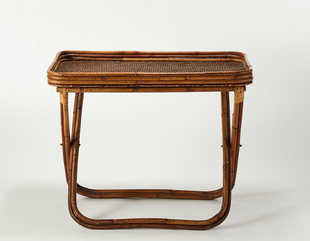 Gabriella Crespi (Milano 1922 - Milano 2017) Tavolino-vassoio pieghevole modello "Pliant", collezione "Bambù", Milano, 1972. Etichetta metallica con firma a incussione "Gabriella Crespi" sotto il piano asportabile (cm 140x90x40) (difetti) Provenienza: Showroom Gabiella Crespi, via Montenapoleone, Milano Collezione privata Accompagnata da dichiarazione di autenticità dell'Archivio Gabriella Crespi, Milano