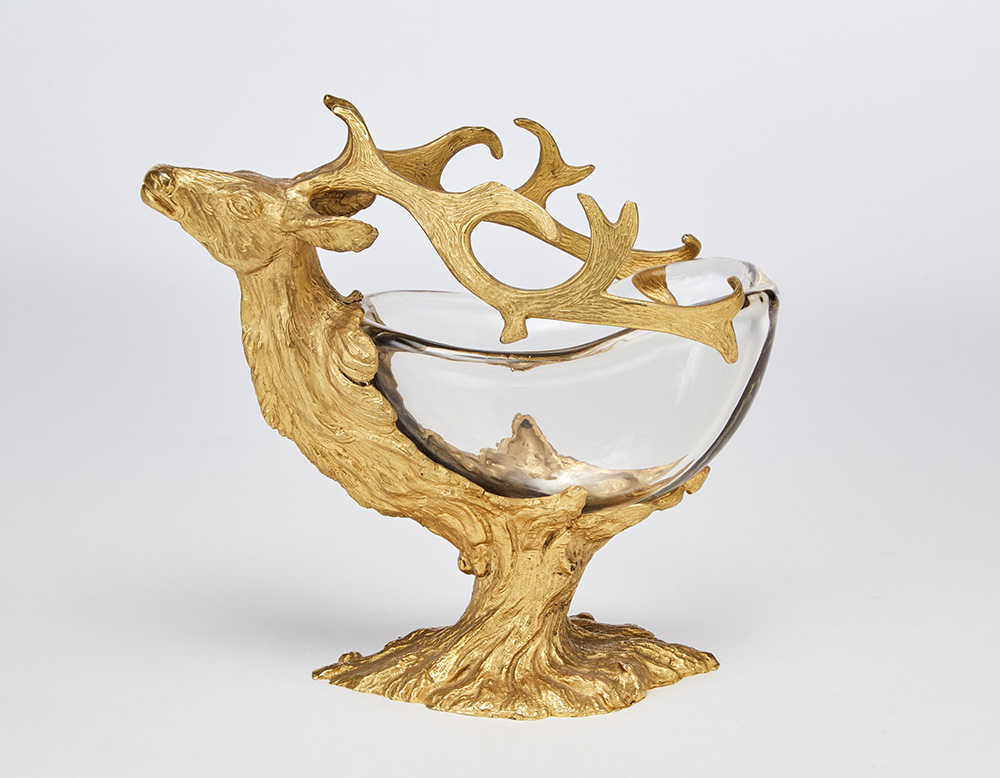 Gabriella Crespi (Milano 1922 - Milano 2017) Coppa modello "Cervo", in bronzo a cera persa dorato e vetro soffiato Barovier & Toso. Milano-Murano 1970. Firmata a incussione sotto la base "Gabriella Crespi" (cm 25x25x13) Esposizioni: esemplare esposto alla mostra "Gabriella crespi Il segno e lo spirito", Palazzo Reale, Milano 24 settembre 2011-16 ottobre 2011. Provenienza: Showroom Gabiella Crespi, via Montenapoleone, Milano Collezione privata Accompagnata da dichiarazione di autenticità dell'Archivio Gabriella Crespi, Milano