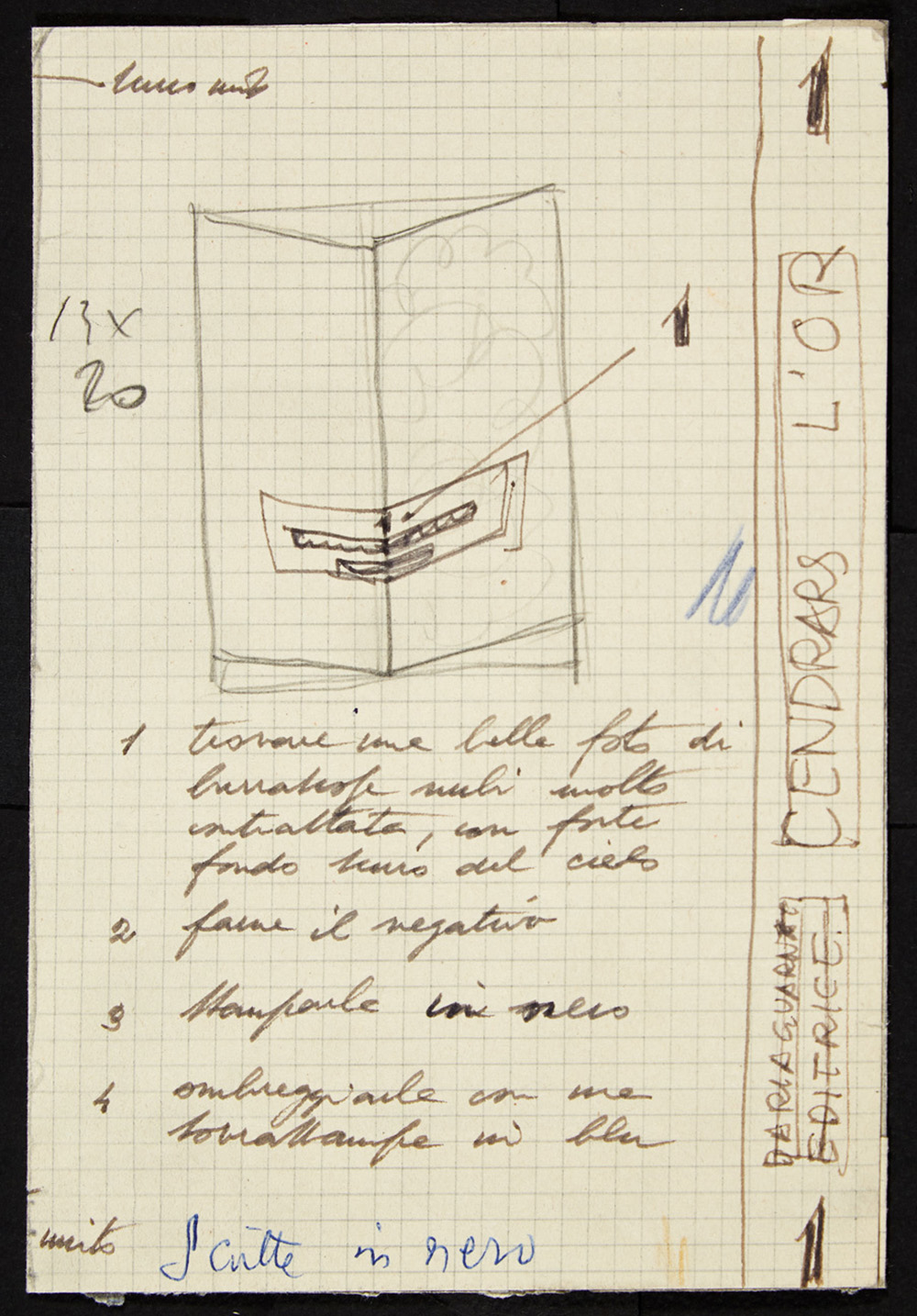 Gio Ponti (Milano 1891 - Milano 1979) "L'oro" Studio per la prima e la quarta di copertina del libro "L'oro" di Blaise Cendrars, per la serie “I Libri della Tempesta”, Edizioni Daria Guarnati. Milano, anni 40. Matita e inchiostro su carta quadrettata. In passe-partout di cartoncino nero (cm 13x19,5) (lievi difetti) Provenienza: Collezione Daria Guarnati, Milano Collezione privata, Milano