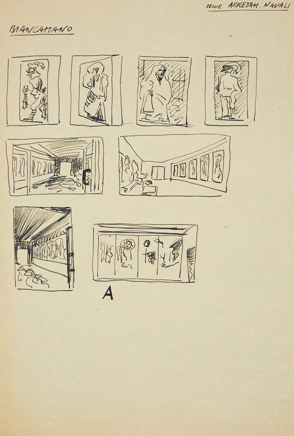 Gio Ponti (Milano 1891 - Milano 1979) "Foto arredamenti navali" Menabò composto da due fogli illustrati con le miniature degli arredamenti navali disegnati da Gio Ponti. Milano, anni 40. Inchiostro nero su carta. In passe-partout di cartoncino nero (cm 21x31) Si tratta probabilmente del canovaccio per una pubblicazione (Su "Aria d'Italia"?) o della bozza per un personale archivio visivo dell'opera dell'autore. Sono identificati da discali e note manoscritte gli arredi progettati per il piroscafo Conte Grande, Giulio Cesare e Biancamano. Provenienza: Collezione Daria Guarnati, Milano Collezione privata, Milano Bibliografia: P. Piccione, Gio Ponti. Le navi. Il progetto degli interni navali 1948-1953, Idea Books, Milano, 2007