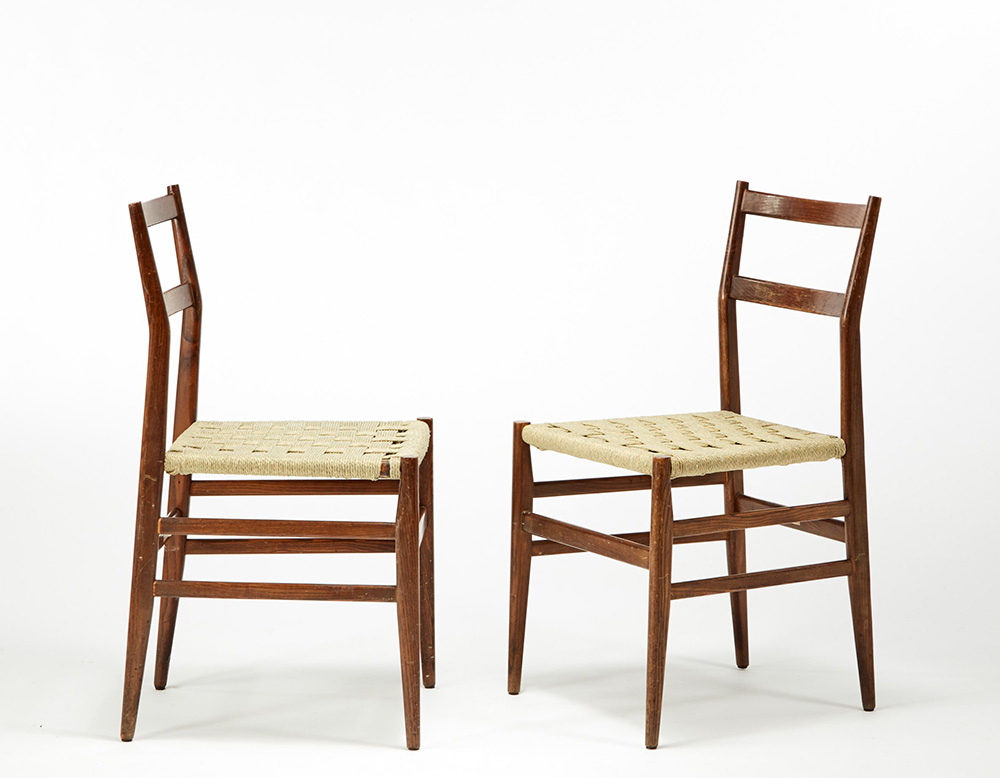 Gio Ponti (Milano 1891 - Milano 1979) Coppia di sedie modello "646 Leggera", Produzione Cassina, Milano, 1951. Legno di frassino, seduta impagliata (cm 43x82x47) (lievi difetti) Bibliografia: "Domus", n. 264-265, dicembre 1951, p. 15; Centrokappa, Il design italiano degli anni 50, Ricerche Design Editrice, Milano 1985, p. 109; Gio Ponti designer, Alinea, Firenze 2007, p. 28; L. Falconi, Gio Ponti. Interior Objects Drawings 1920-1976, Electa, Milano 2010, p. 242
