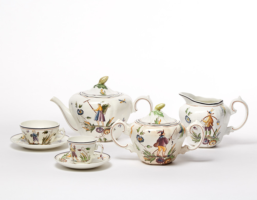 Gio Ponti (Milano 1891 - Milano 1979) Parte di servizio da te e caffè della serie "Ermione" in terraglia smaltata in policromia su fondo bianco sottovetrina composto da undici tazze da te, dodici piattini, nove tazzine da caffè, nove piattini, una lattiera, una zuccheriera, una teiera. Manifattura Richard Ginori, Milano, anni 30 (misure varie) (difetti)