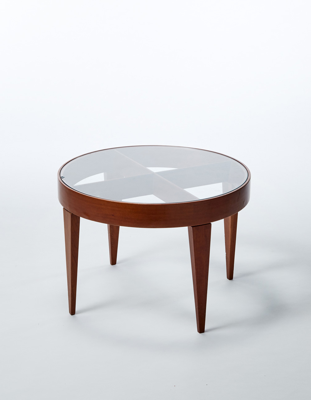 Neoponti Tavolino basso circolare modello "Anna", ispirato al tavolo disegnato da Gio Ponti per l'arredamento Borletti nel 1932. Milano, 1997. Quattro gambe rastremate, fascia circolare e due correnti a crociera sotto il piano in legno massello, piano in vetro. Numerato "0251/97" e recante etichetta originale "NEOPONTI - DESIGN GIò PONTI - Made in Italy - PRODUCED BY COSTANTINO" (d cm 55, h cm 37) (lievi difetti) Provenienza: collezione privata, Milano Circular coffee table model "Anna" inspired by the table designed by Gio Ponti for the Borletti furnishings in 1932. Milano 1997. Numbered "0251/97" bearing original label NEOPONTI - DESING Giò Ponti - Made in Italy -PRODUCED BY COSTANTINO" (d cm 55,h cm 37) (minor defects) Provenance: private collection Milano