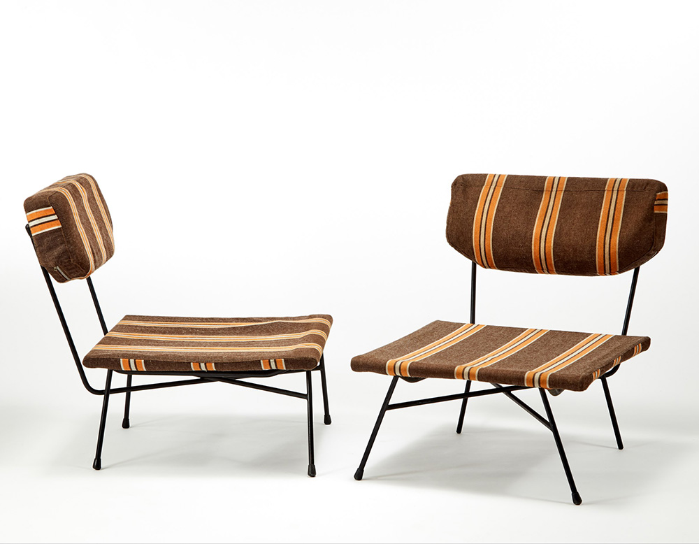 BBPR (Banfi, Barbiano di Belgiojoso, Peressutti, Rogers) Coppia di poltrone modello "Elettra". Produzione Arflex, Italia 1956 ca. Tondino metallico saldato e laccato nero, rivestimento originale in tessuto marrone a strisce arancioni e beige (cm 59x69,5x66) (lievi difetti, mancanti dei cuscini) Bibliografia: "Domus", n. 324, novembre 1956, copertina e p. 31; R. Aloi, Mobili tipo, Hoepli, Milano 1956, p. 208; "Domus" 395, ottobre 1962, p. 76; Centrokappa, Il design italiano degli anni ?50, Ricerche Desgin Editrice, Milano 1985, p. 118; E. Bonfanti, M. Porta, Città, museo architettura. Il Gruppo BBPR nella cultura architettonica italiana 1932-1970, Hoepli, Milano 1973, pp. A92; I. De Guttry, M. P. Maino, Il mobile italiano degli anni ’40 e ’50, Laterza, Bari 2010, p. 96; G. Gramigna, Repertorio del design italiano 1950/2000 per l'arredamento domestico, Allemandi Torino 2003, p. 31