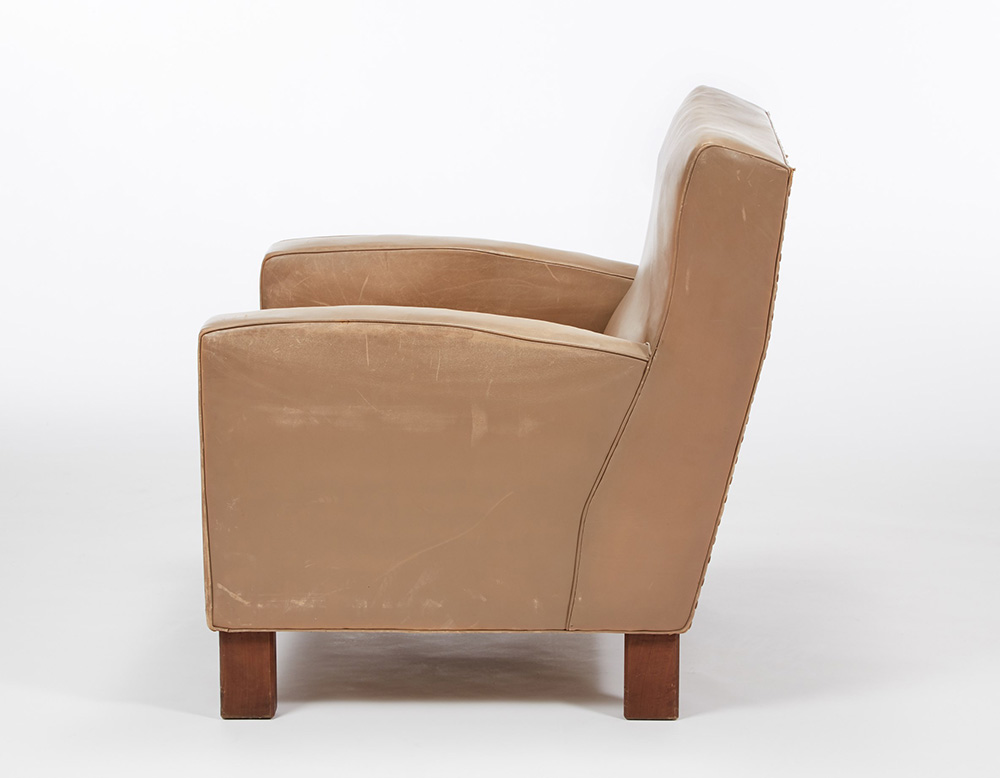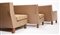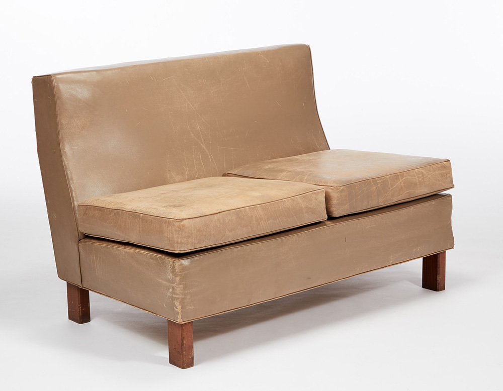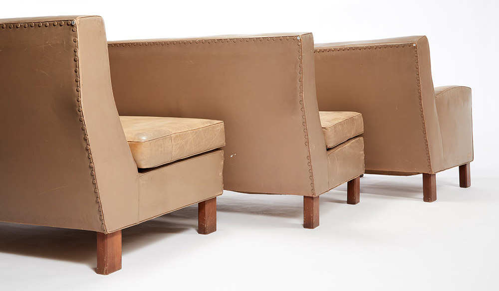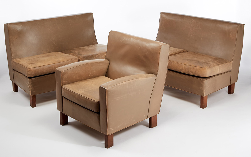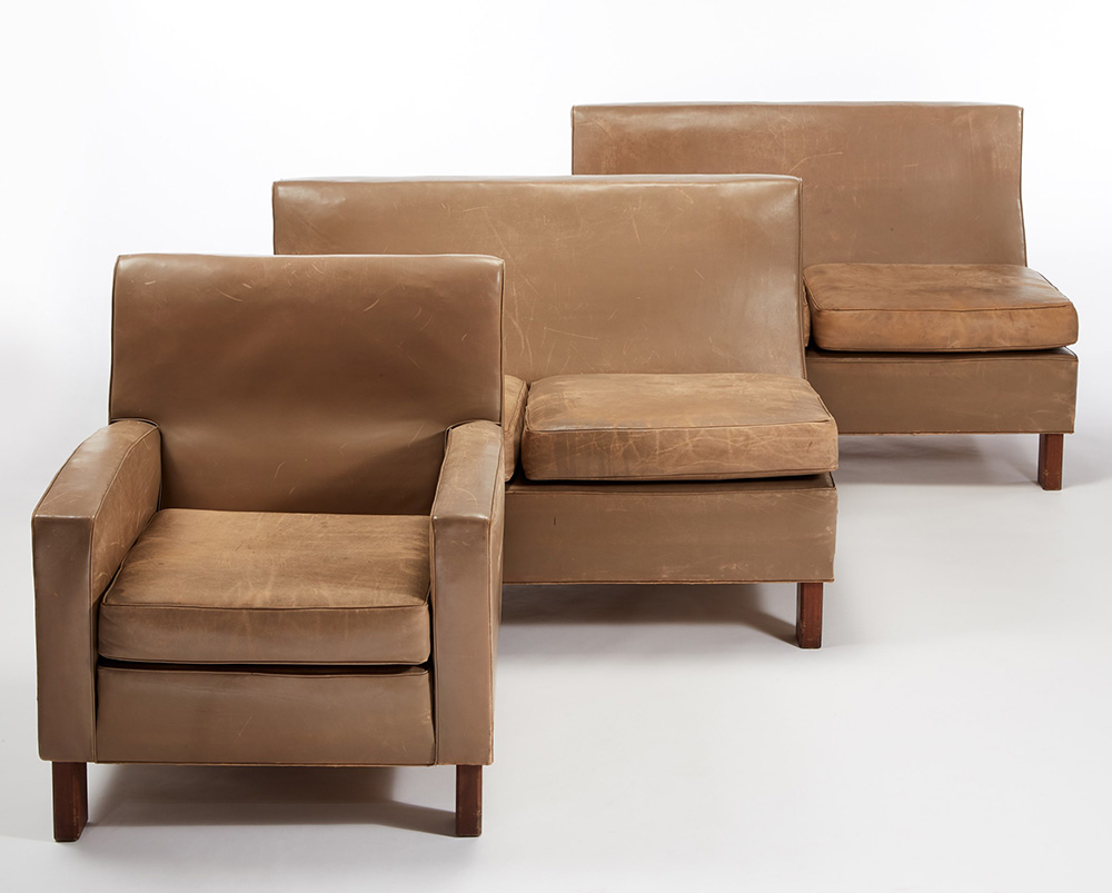 BBPR (Barbiano di Belgiojoso, Peressutti, Rogers) Salottino composto da due divanetti e una poltrona con struttura in legno, gambe in legno massello a sezione ottagonale, rivestimento in pelle beige. Esecuzione Pierino Frigerio, Cantù 1962 ca. (cm 127x82x70 e cm 77x80x77) (difetti) Provenienza: Villa Z.P., Stresa, 1962 ca. Bibliografia per una poltrona simile: Riforma e arredamento di una casa a Milano, in "Domus", n. 146, febbraio 1940, p. 46