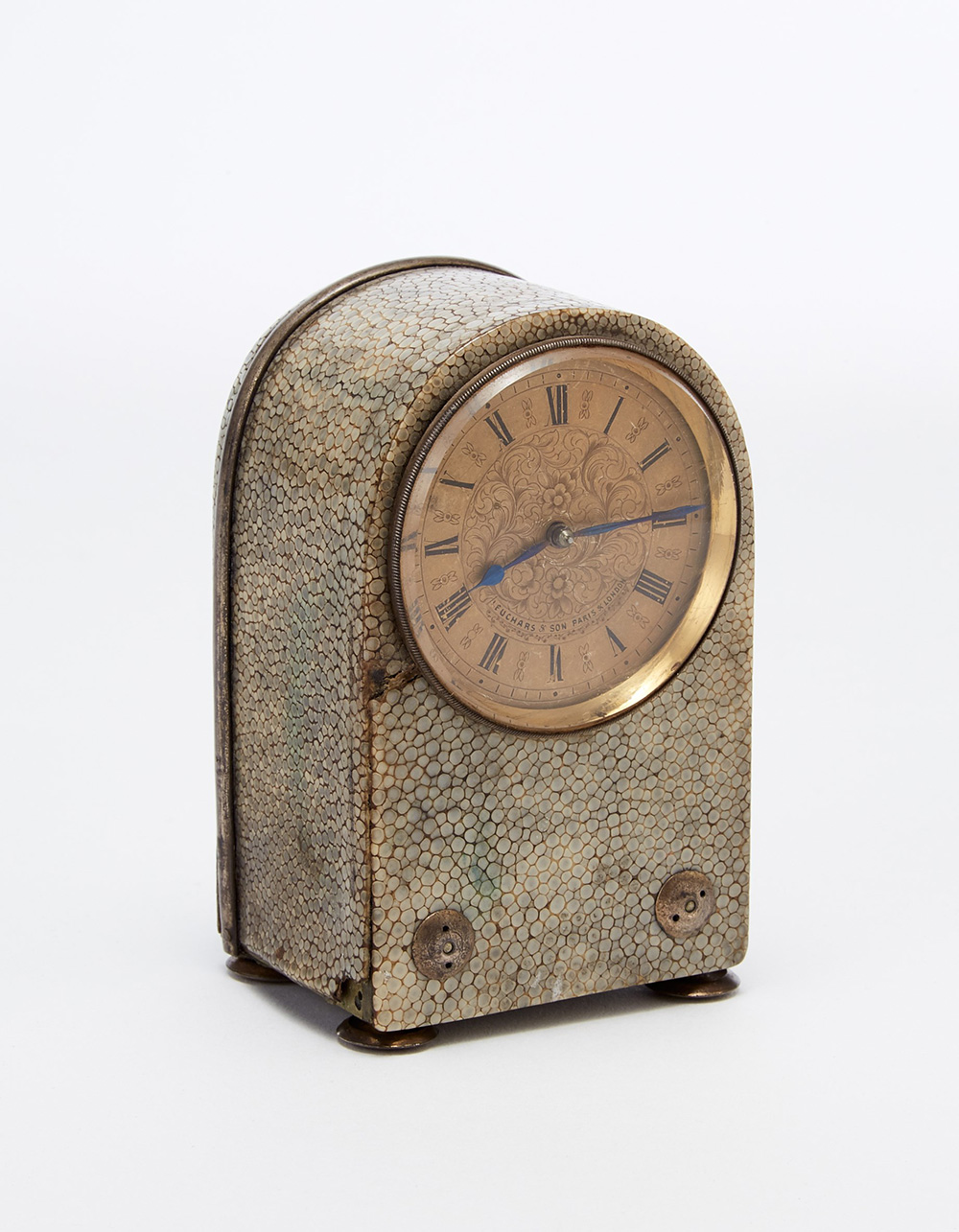 Orologio da tavolo Déco in ottone, rivestito in galuchat grigio-crème. Quadrante cesellato e numerato con cifre romane, lancette in acciaio brunito, movimento meccanico con carica a chiavetta. Francia, 1925 ca (cm 6x9,5x4) (difetti e mancanze) Provenienza: William Bowman, Milano
