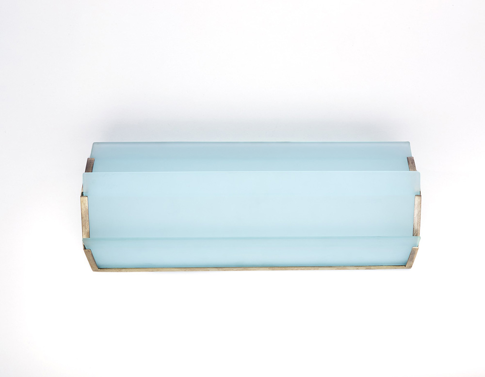 Jean Perzel Applique Déco di forma geometrica con struttura in ottone di forma pentaedrica, schermi diffusori in lastre di vetro satinato sprogenti dalla struttura. Francia, 1925 ca. (l cm 46) (lievi difetti) Provenienza: William Bowman, Milano