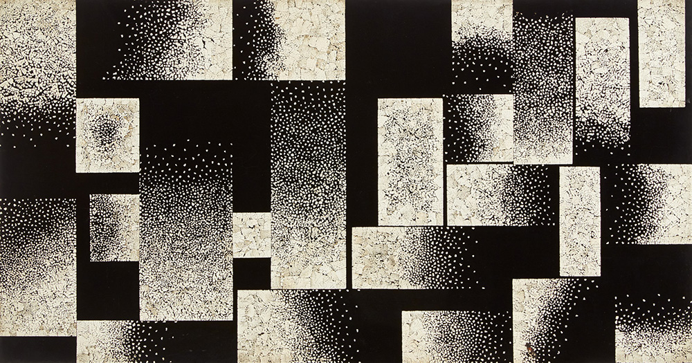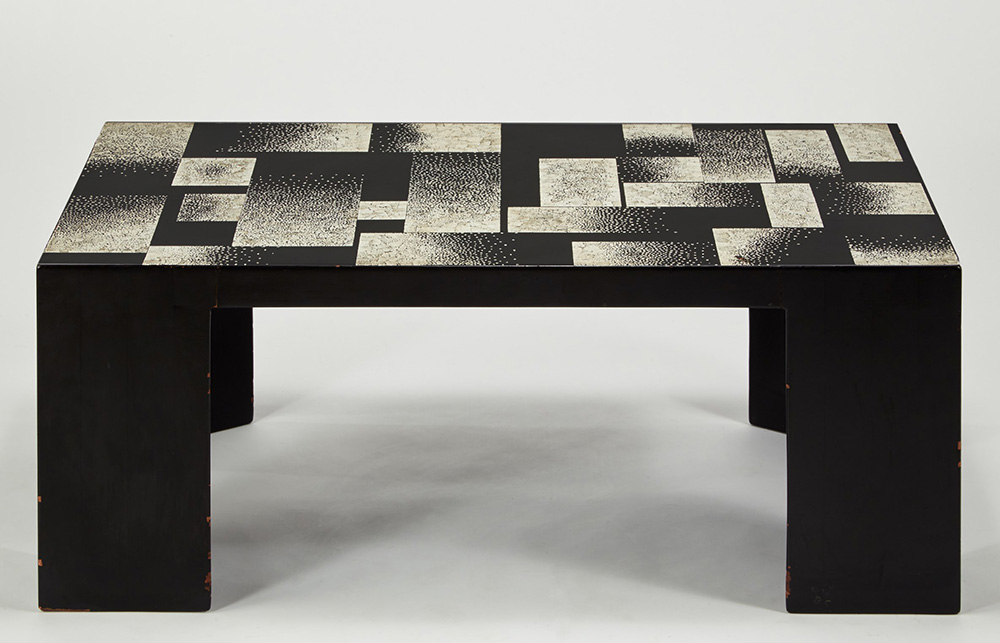 Jean Dunand (1877 - 1942) Tavolino Déco in legno rivestito in lacca nera e guscio d'uovo a motivi geometrici. Francia, 1925 ca (cm 110x4x58) (difetti) Provenienza: William Bowman, Milano Bibliografia per esemplari simili: Galerie du Luxembourg, Jean Dunand. Jean Goulden, catalogo della mostra, Imprimerie du Sommet, Paris 1973, pp. 21, 101; A. Duncan, Déco, electa, Milano 2009, p.288.