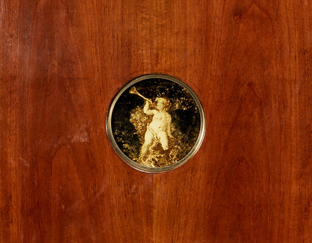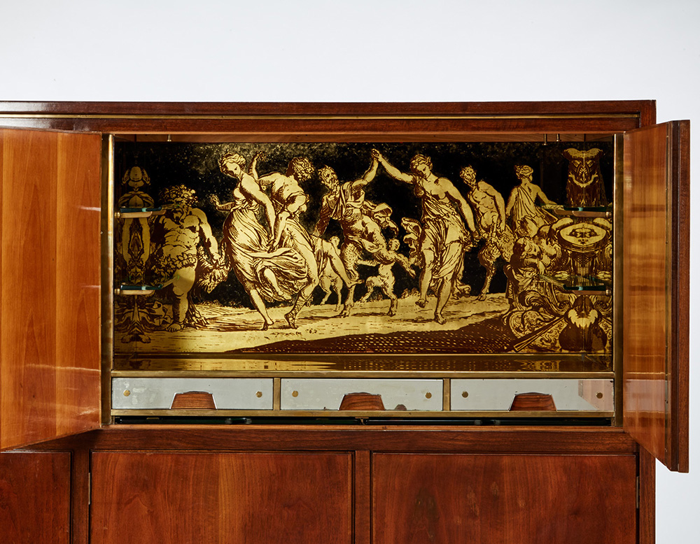 Mario Quarti (1901 - 1974) Mobile bar in legno di noce massello e impiallacciato, con tondi in vetro decorati a smalto dorato con soggetti allegorici, interno rivestito in vetro decorato a smalti dorati. Puntali in ottone. Milano, 1940 ca (cm 165x160x46) (lievi difetti) Bibliografia: I. De Guttry, M. P. Maino, Il mobile déco italiano, Laterza, Roma-Bari 2006, p. 240 Walnut wood and veneered bar cabinet decorated with allegories. Brass sabots,. Milano, 1940s circa (cm 165x160x46x) (minor defects) Bibliography: I. De Guttry, M. P. Maino, Il mobile déco italiano, Laterza, Roma-Bari 2006, p. 240