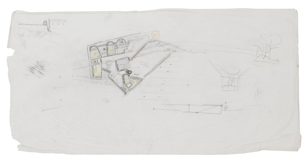 Carlo Scarpa (Venezia 1906 - Sendai 1978) Studio planimetrico per Villa Ottolenghi. Scala 1:250. Grafite e pastelli colorati su carta da schizzi tipo Vangshir (cm 30x60). Schema iniziale di progetto: tre camere a monte sono risolte come absidi scavati nel pendio, separate da un piccolo patio. Il soggiorno è impostato a forma di "C" verso sud, attorno ad una vasca esterna; un camino di forma circolare e la camera da letto matrimoniale concludono la pianta verso sud ovest. Non c'è traccia né della calle né dell'accesso a monte da via Carlo Scarpa. Provenienza: collezione privata, Verona Plan of Villa Ottolenghi. Scale 1:250 Graphite and coloured pastels (cm 30x60) Provenance: Private collection