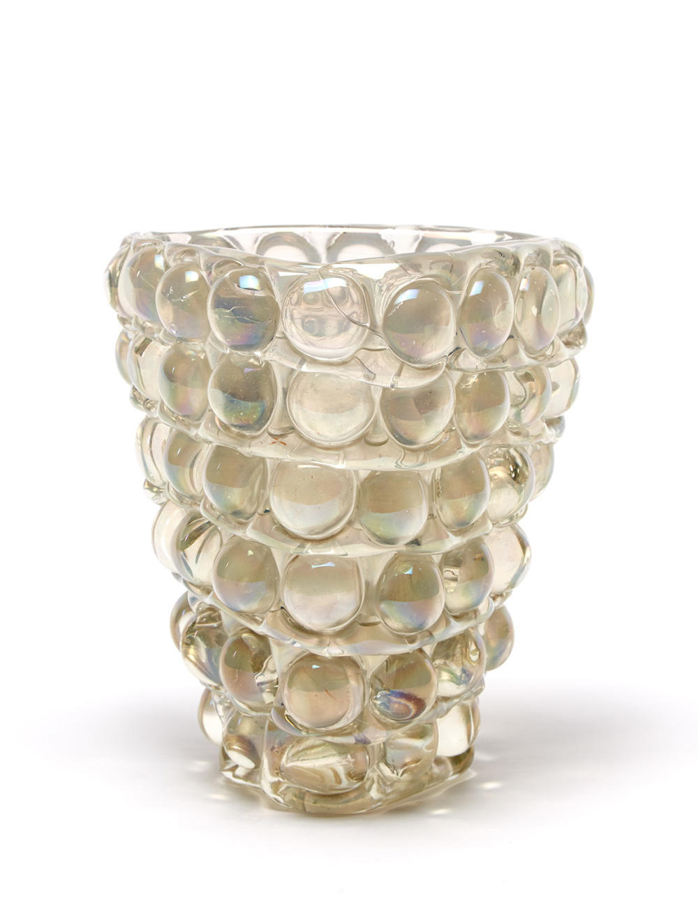 Ercole Barovier (Murano 1889 - Venezia 1974) Vaso a sezione triangolare e corpo svasato della serie "a lenti" in vetro incolore leggermente opalescente e fortemente iridato sulla superficie esterna. Manifattura Barovier & Toso. Murano, anni 40 (h cm 27)