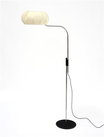Lampada da terra con base circolare, in metallo nero asta regolabile cromata e curvata nella parte superiore. Produzione italiana, anni 70 (h regolabile) (difetti)