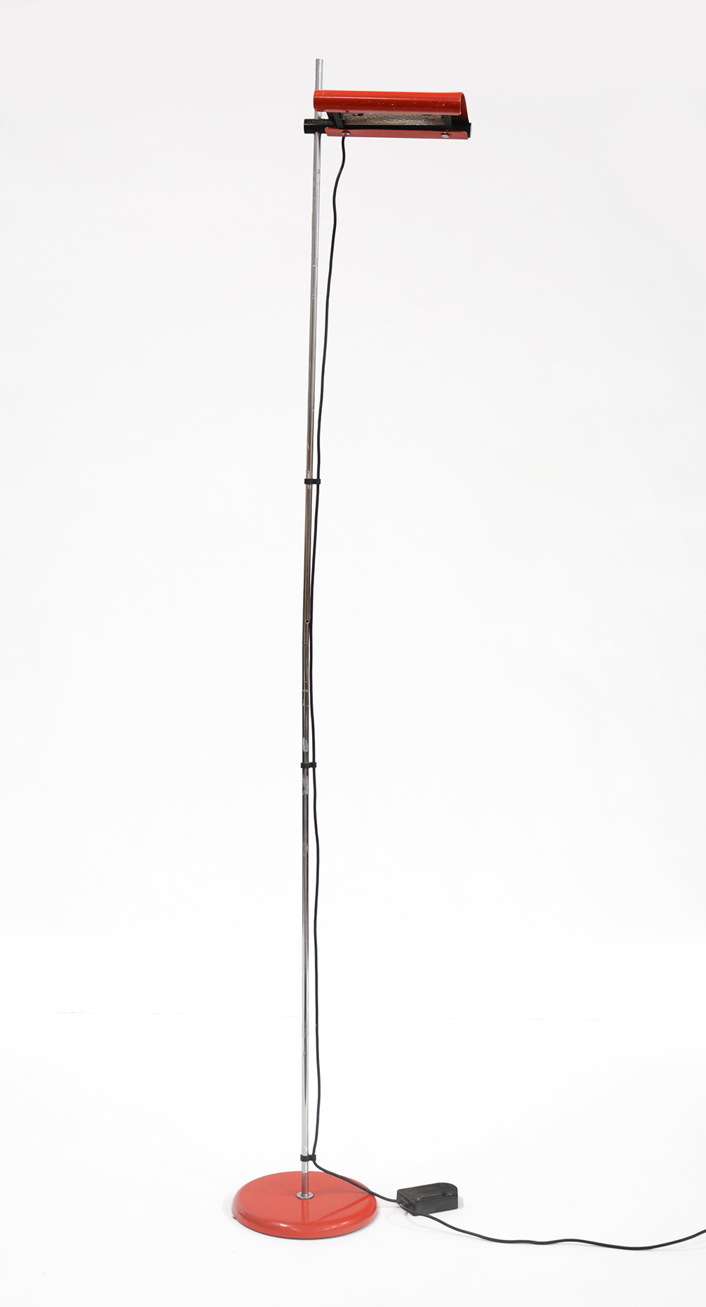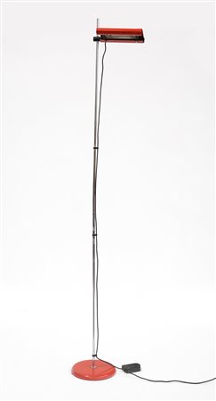 Lampada da terra in metallo verniciato rosso e asta cromata, lampada regolabile. Produzione O-Luce, Milano, anni 70 (h cm 203) (difetti)