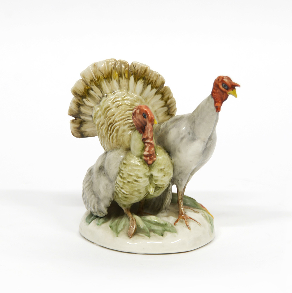 Cacciapuoti "Tacchini" Scultura in ceramica formata a colaggio e smaltata in policromia sottovetrina raffigurante una coppia di tacchini. Italia, seconda metà del sec XX. Firmata alla base (h cm 15) Polychrome glazed ceramic sculpture representing a pair of turkeys. Italy, second half of the XX century. Signature to base (h cm 15)