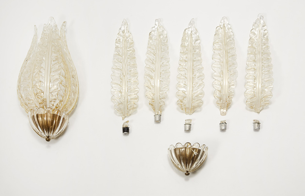 Venini (attribuito) Coppia di appliques a cinque foglie in vetro incolore con...