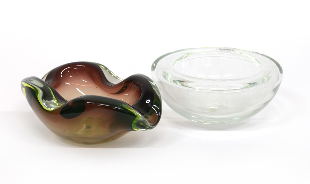 Manifattura di Murano. Lotto di due posacenere in vetro trasparente e sommerso policromo, uno con firma incisa "Barbini"