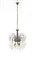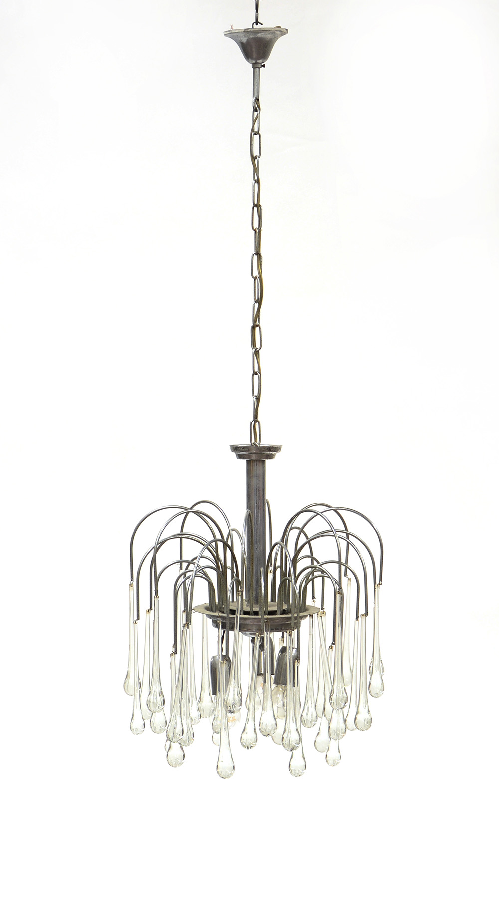 Lampadario a tre luci in metallo cromato con numerosi pendenti a goccia in vetro. Italia, anni 70 (mancanze)