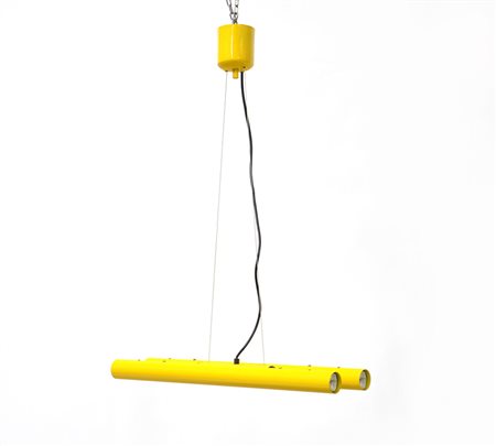 Lampada a sospensione a quattro luci di forma tubolare in metallo verniciato giallo. Italia, anni 80 (difetti)