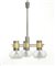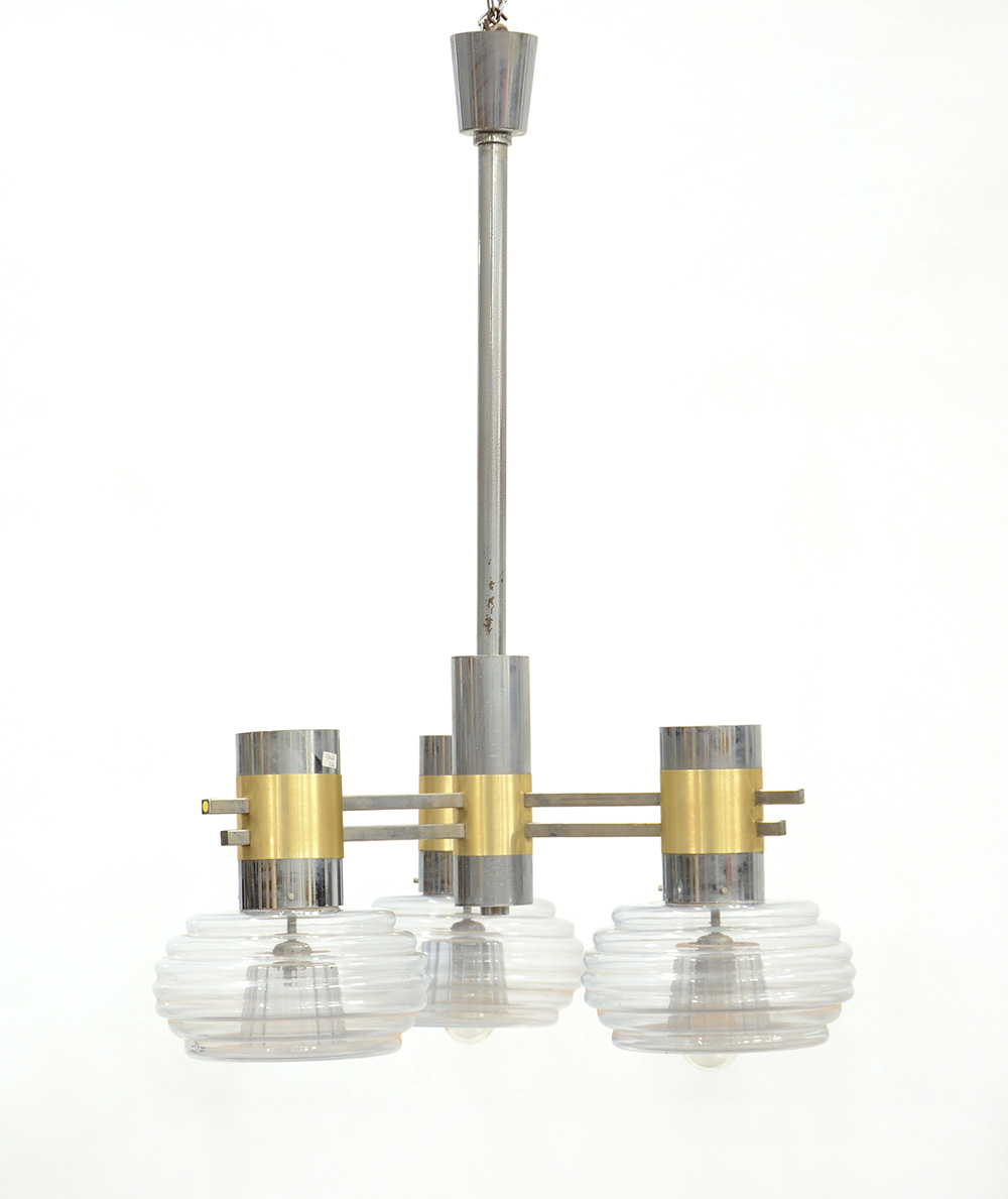 Lampadario a tre luci con struttura tubolare in metallo cromato e parzialmente dorato, con paralumi in vetro. Italia, anni 70 (h cm 100) (lievi difetti)