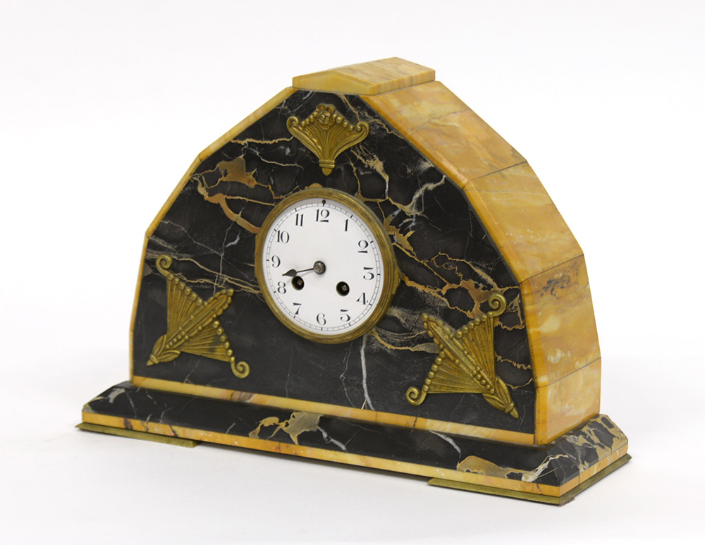 Un orologio da tavolo Déco lastronato in marmo nero venato e giallo. Anni 30...