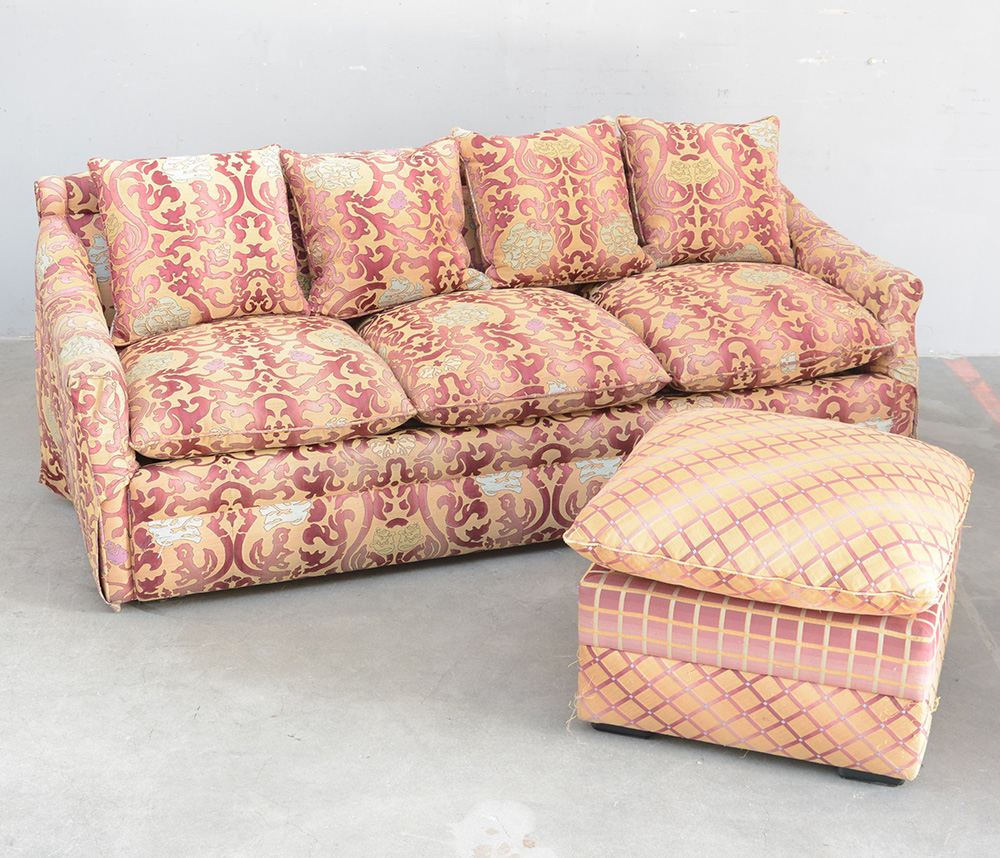 Luigi Caccia Dominioni (Milano 1913 - Milano 2016) Divano a tre posti modello "P16 San Siro" unito ad un puff. Produzione Azucena, Milano, disegno del 1967, esemplare degli anni 80. Tessuto a quadri nei toni giallo e vinaccia (divano: cm 190x75,5x79 puff: cm 59x31x59) (difetti)