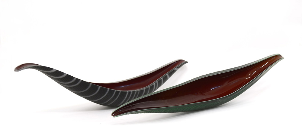 Due soprammobili in vetro incamiciato bordeaux, verde e bruno e con fasce lattimo, battuti sulla superficie esterna. Murano, seconda metà del sec XX (l max cm 97)