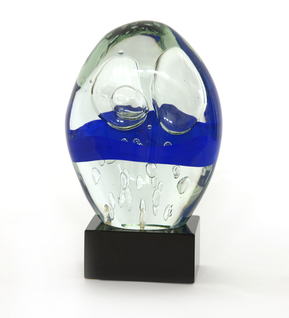 Manifattura di Murano. Scultura in vetro massello a bolle, incolore e blu...