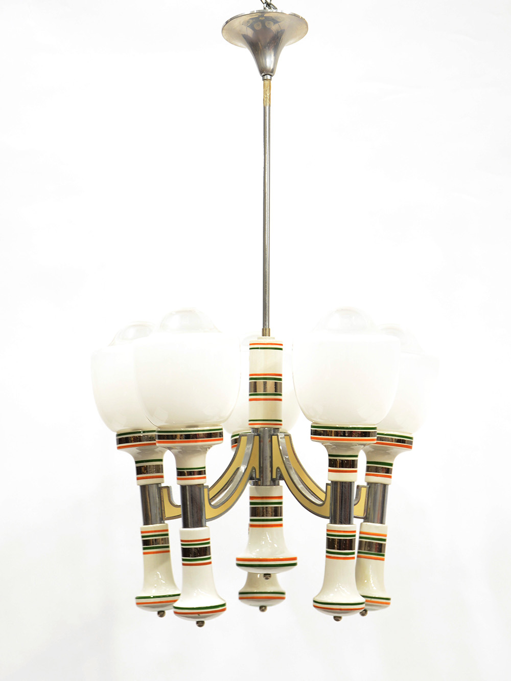 Lampadario in ceramica e metallo cromato. Italia, anni 70 (h cm 103) (lievi difetti)
