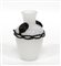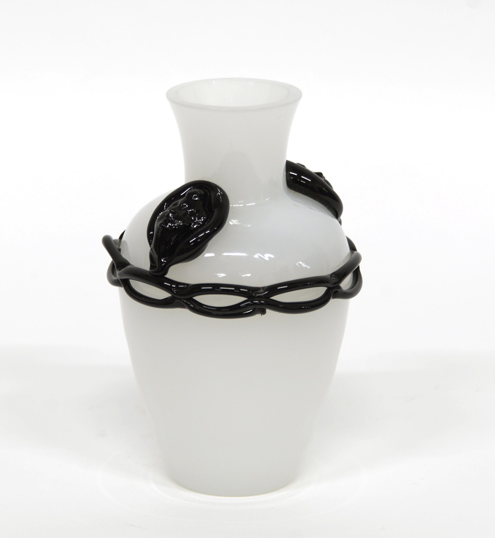 Manifattura di Murano. Vaso all'antica, in vetro opalescente con decori applicati in vetro ametista scuro a catenella e figure di volti femminili. Esecuzione recente (h cm 20,5)